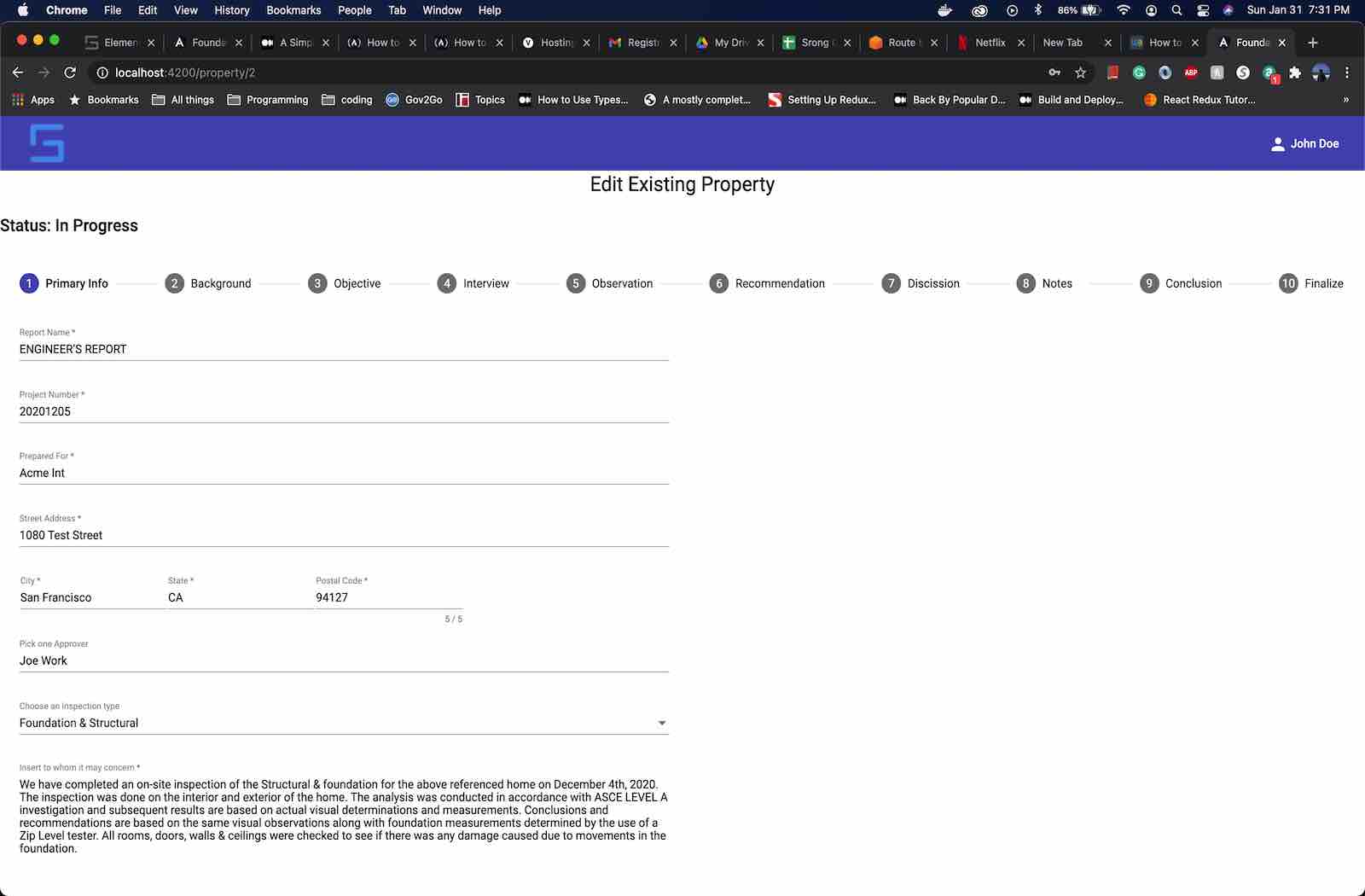 The Srong Inspector System is a cloud based solution to create and generate inspection reports. It was created for property inspectors to generate a PDF report about the properties they inspect. Our application allows customized comment generation and enables the inspector to choose the comment that fits the description of the items they inspect rather than typing a comment every time. The generated report can we either stored locally or emailed to the desired party. The application also enables approval system, so that the created report can be validated by another inspector. This increases the realibility of the report. Srong Inspector also implements a seperate Image management System to handle all the visual observation in one place.